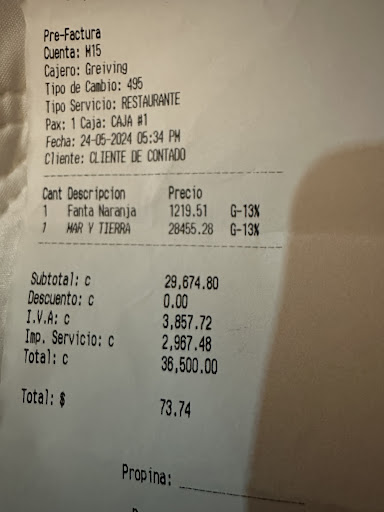 Read moreCame here after a year which previous experience was great! But man did it change! First we showed a picture of the meal we had the year we came and the waiter was dismissive about it (even though this is why we came back). Did not give us an answer just kept telling us they have New York and some other cut of steak. We did not know the cut we got before because the time before the waiter told us it was a local type of cut. Anyway we decided to order the surf and turf special thinking maybe it was the skirt steak cut. Also wanted to share the plate since we were not super hungry and the waiter instantly had a disappointed face when we ordered that. The food itself wasn’t bad a chewy cut of steak, 4 average pieces shrimp and a small potion of veggies. Got the check and to our SURPRISE it was 36,500 colones ($73.74 dollars). Looking at the menu the average steak plate was 9,000-16,000 colones even with the 4 pieces of shrimp we thought this was outrageous!! So overall we walked out feeling ripped off for a mediocre meal and poor service! Will not be returning which is disappointing after having such a wonderful...