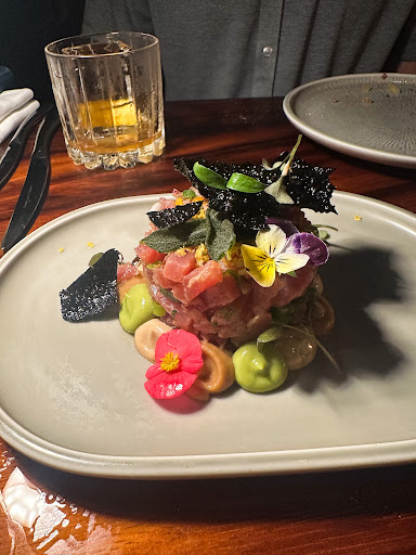 To start, we were treated to complimentary appetizers—a pineapple crisp and focaccia with a unique spicy whipped butter and hibiscus salt. I enjoyed a refreshing tropical cocktail, while my husband loved his coffee-based Old Fashioned. We shared the Tuna Tartare, which was delicious, followed by our entrées—Pollo al Pesto for me (which I’m still dreaming about!) and a perfectly cooked lobster tail with coconut rice, plantain crisps, and Caribbean pepper sauce for my husband. Every dish was beautifully crafted with incredible flavors.