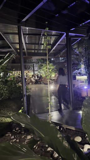 The vibe here is effortlessly cool. You’re sitting in a sunny indoor/outdoor space that’s covered but open, beautifully designed with a laid-back lounge feel, complete with amazing music from the adjacent bar. It’s welcoming, stylish, and perfect whether you’re with friends or on a special night out.