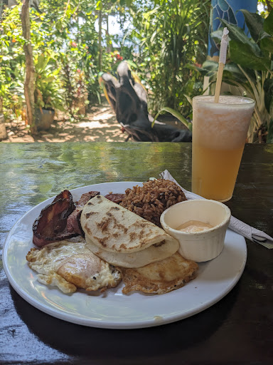 Read moreExcellent, authentic, local food in a lovely garden steps from the ocean. I entered beach side and exited out on the street. I had traditional gallo pinto with fried eggs, tortilla, and the best bacon I've had in Costa Rica yet! I also loved my cantaloupe drink - fabulous. An added bonus were the little chickens wandering the property and the friendly cat. It's a shaded space with light ocean breezes and cute decor. The staff are lovely and the food is plentiful and comes out fast. There is a sign with menu items written in English if you don't speak Spanish....