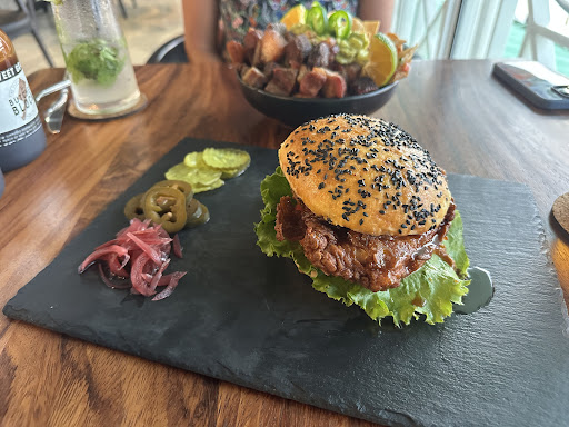 For mains, we shared the hot honey chicken sandwich and BB’s House Chifrijo — both absolutely nailed it. Perfectly seasoned, generously portioned, and served with a selection of house-made sauces that had me doing that obnoxious happy food dance.