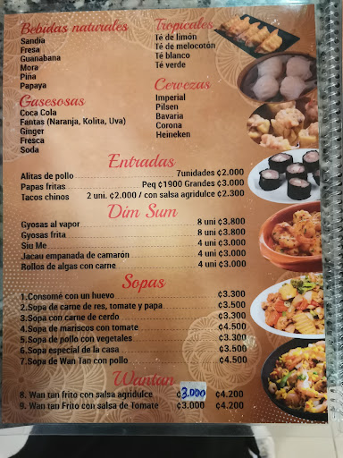 La comida es deliciosa! Es mi restaurante de comida china favorito. En especial el arroz cantones y las alitas fritas. También venden dim sun. En precios es super accesible, desde los 2500 hasta los 5000 aprox. por platillo. Tiene un pequeño parqueo afuera. Aceptan tarjeta. Por la pandemia únicamente se puede pedir para llevar. Super...