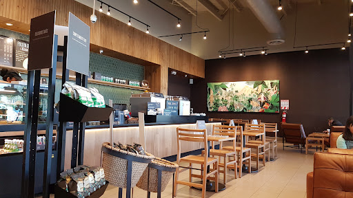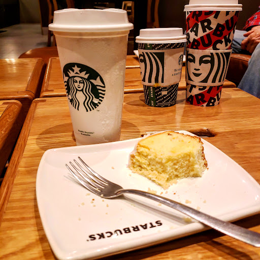 This Starbucks is attached to Paseo de Flores, it is a large size, with both indoor and outdoor seating, the outdoor side is large and covered from the elements. Service is good here, and it has all the Starbucks sandwiches and other goodies to eat. Parking at Paseo is usually crowded, but it is free outside, not sure about the parking garage. Also, some big comfy leather lounge...