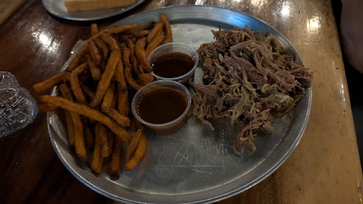 Our food came right as we finished. I had the pulled pork sandwich and fries. The sandwich was big with lots of meat. On the sandwich were pickles that were battered and fried. They gave a nice flavor to the bite. The fries were amazing. You'll have to try them and make sure to drip them in the BBQ sauce. My husband had the brisket with fries and potato salad. I tried the brisket, nice flavor and moist. Really good and I'm not a brisket fan. The potato salad was homemade and really good. My son had the Mac and cheese. It was good portion of homemade baked mac and cheese. He ate it up.