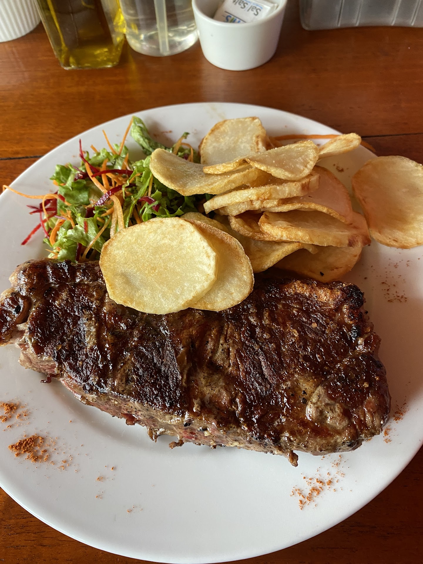 As for the food, the proteins were delicious. Three of us ordered steaks and one had the chicken schnitzel. The meats were well-cooked and flavorful, but unfortunately, that’s where the positives ended. The sides—garden salad and fries (or a type of potato chip)—were underwhelming, especially considering the hefty price of the meals.