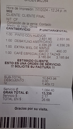 Read moreIts been a while since the last time i wrote a bad review but this place deserve it. I went for breakfast because i wanted to have a traditional Costa Rican breakfast ... for my surprise choosing this place was a mistake. First i was the only one there and took around 35 min to get my food. After the food arrives the Gallo Pinto was burnt, old and crunchy. At that point my breakfast was ruined, i told the waiter about it and he saw the rice but didnt do anything. At the end to appoligize he offer me a coffee.... really? I was expecting not being charge for that horrible breakfast. Im not surprised...