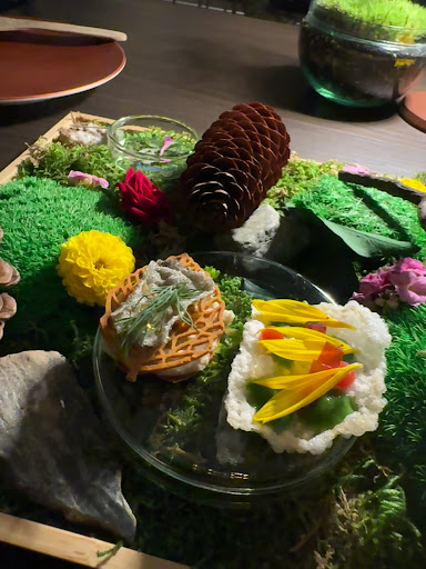 A miniature garden arrived with 5 miniature ‘tastes’. Now I have to be honest here, apart from the incredible way these flavours were presented, I was blown way with the strength of flavours. As with everything, there was a story to be told on what the flavours were and how to eat them. Such small flowers packed an amazing strength and spectrum of flavours - I wish I could tell the story here, but it’s a must.