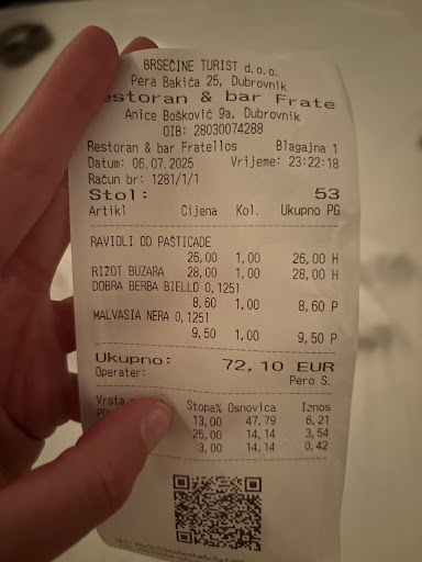 Read moreFratellos is a beautiful outdoor restaurant just a 15 minute walk outside of old town Dubrovnik. The views are phenomenal, as it’s perched up high, right on the water.
