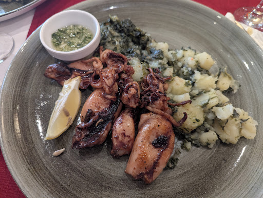 We shared a cheese plate to start (really good!), and I had the grilled squid as my main. It was perfectly cooked and came with a garlic, olive oil, and parsley dip that I used for every bite — so good. It also came with cabbage and potatoes on the side, which worked really well with the dish.