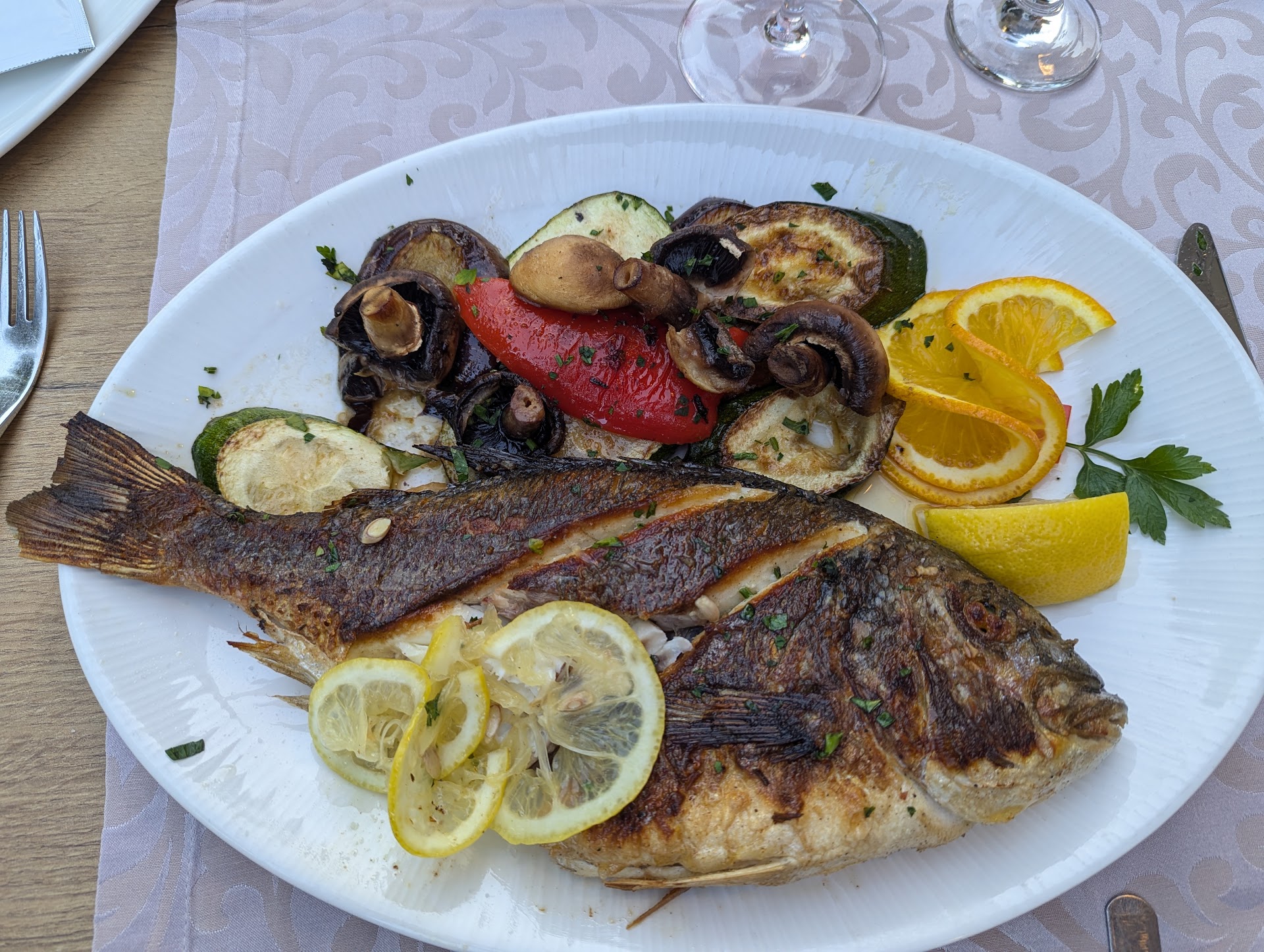 Doch die wahre Stärke des Restaurants liegt in seiner Küche. Die Speisekarte bietet eine große Auswahl an traditionellen dalmatinischen Gerichten, die mit frischen, lokalen Zutaten zubereitet werden. Wir haben uns für die gegrillte Lammkeule mit Rosmarinkartoffeln entschieden und wurden nicht enttäuscht. Das Fleisch war zart und saftig, die Kartoffeln knusprig und aromatisch.