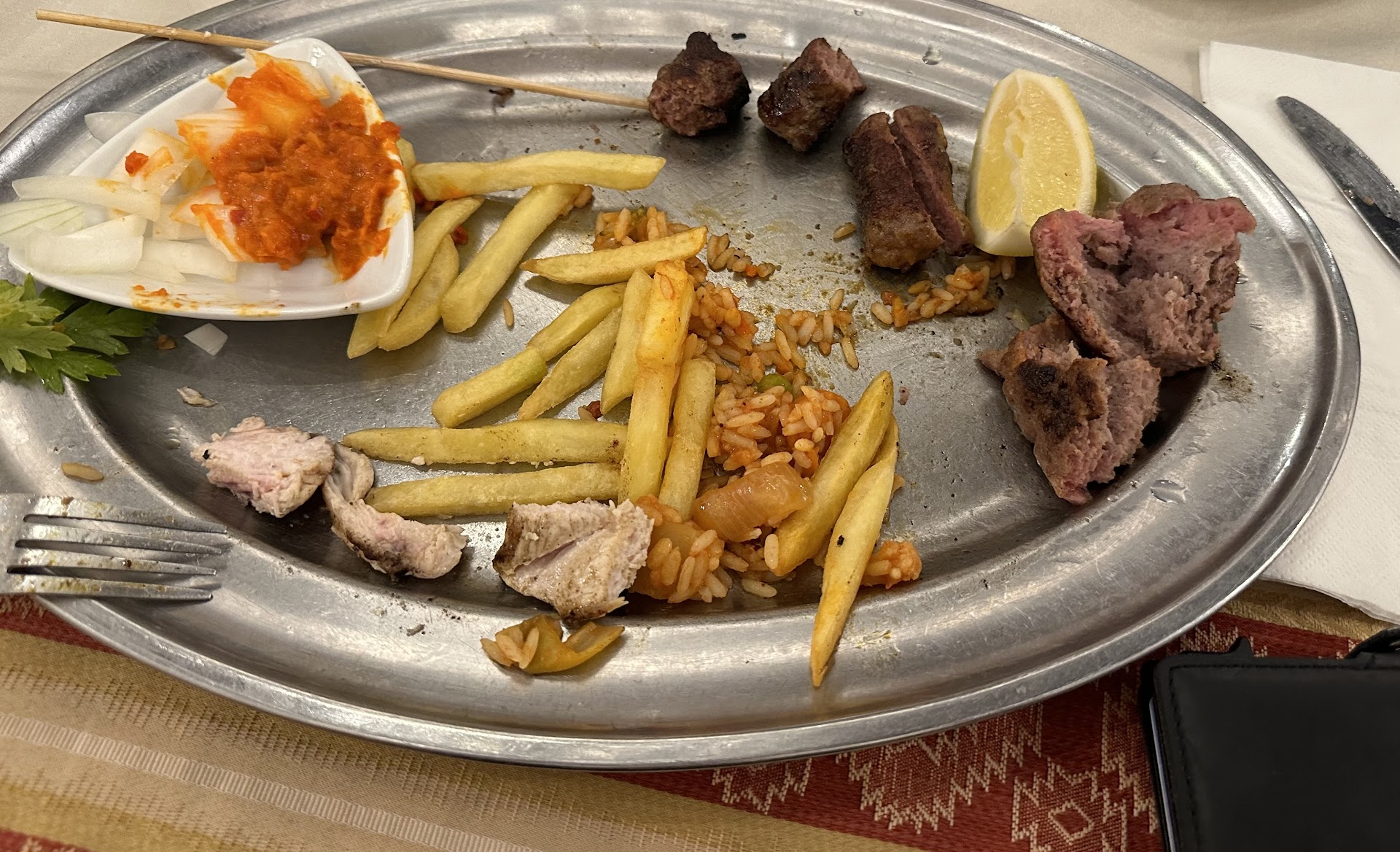 I ordered a meat platter for €24, but what I got was raw meat (tiny portion) — absolutely not worth the money and it borders on bodily harm. I didn’t notice the raw spots immediately, so I ate some of it. But honestly, there wasn’t much more on the plate than what’s shown in the picture. I ate the rice and fries.