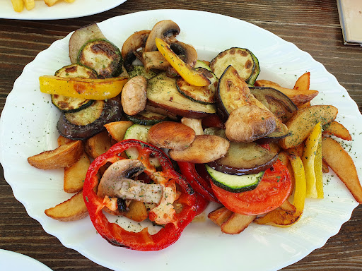 Food was simple but very tasty. (Chicken kebab & grilled veggies both with fried potatoes). Could have enjoyed a side salad or some sauce but we both finished our meals and enjoyed doing it even without any extras. Portions were large.