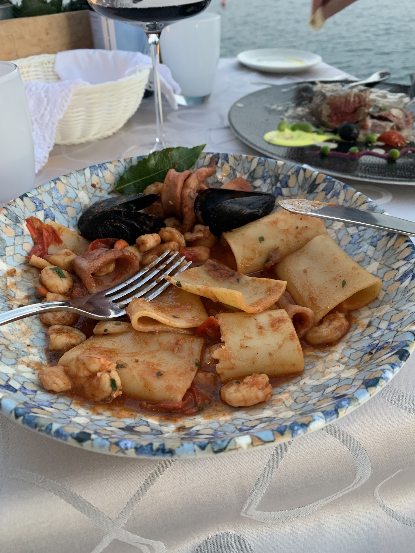 The food was justâŠ.dull - a Puntulina Pasta (Huge Macaronis with Seafood and Tomato) for 25 Euro and a Truffle Tagliatelle for 27 Euro. This is 52 Euros for two pasta dishes and the chef was somehow missing any spices / flavor. They served a small appetizer beforehand with anchovies on bread which had no taste at all. We also had a 9 euro Virgin Mojito that had no taste whatsoever - very disappointing in total - except the refreshing Karlovac beer on a hot evening.