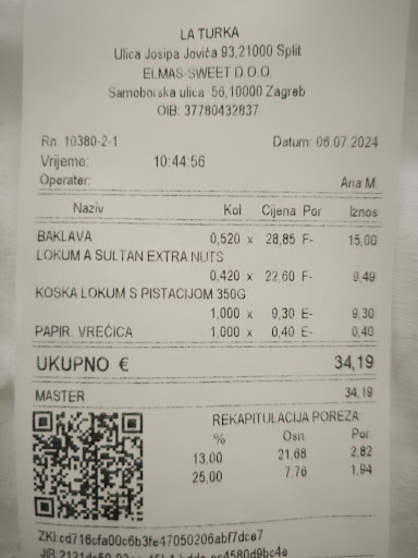 Specijalizirana turska trgovina i slastičarna koja se nalazi u prizemlju trgovačkog centra. Među tradicionalnim turskim specijalitetima u ponudi ćete pronaći najpopularnije baklave (koje su svježe, hrskave i jako ukusne, cijena je 25,88€/kg, može birati različite vrste), tursku kavu i čaj, rahat lokum, halva, čokoladne kockice, sušeno voće i orašaste plodove, umake, namaze, začine... Brza i ljubazna...