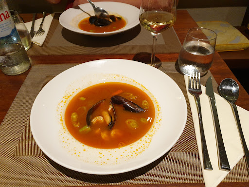 The staff is super friendly and inviting, they also have no problem to adjust the meal to safely accomodate a glutenfree diet. The white wine (Malvazija?) they recommended was also really good. The restaurant seems to go for a French haute cuisine, which they do really well! We both ordered the bouillabaisse soup (with no bread) and the hama fish. The soup was good but a bit bland and thin. I understand that because of my dietary restrictions that the bread is a essential part of the course, but without it, the soup is rather empty. I'd recommend to add more vegetables, like carrot, spring onions and potatoes, so it gets more body. Or just serve gluten free bread 😉. Flavour wise the soup could use more salt and garlic. Or some fresh flat parsley. The hama fish was very good, better than the soup. The sauce (made out of lentils, tomatoes and herbs) was heavenly! In my opinion, the amount of fish was a bit low for 25 euros. The portion of the main course was also fairly small. I'd suggest to add a few boiled potatoes in skin which are shortly stir fried in butter, garlic, onion powder, and chives. It would make the meal more filling. The ambience in the restaurant is also really great! Well designed, pleasant to look at, nice music. All in all, a great restaurant but the dishes could use some bigger portions and a bit thicker texture....