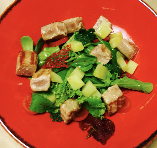 Main dish tuna stake, besides dirty plate, for sauce I feel like they used remains of soup, 2 broccolies were tasless just boiled and luke warm. And you get fried potato croquettes from store. Terrible!