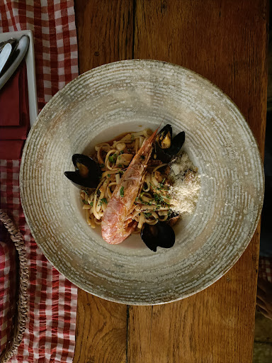 Read morePlease don't be seduced by the beautiful courtyard and the apparently nice staff. This is by far one of the worst restaurant we have ever been to. The starters we shared were oke, scampi and octopus from the grill did taste good, but also we had four different main dishes and none of these four dishes were what you expected. The first dish was gnocci with prosciutto and mushrooms, which looked more like a ready-made pot containing cooked bacon bits and small pieces of mushrooms that you could barely recognize. Another dish was black risotto with seafood, but it was not at all clear which seafood was actually in it as everything tasted the same and there was hardly any clearly recognizable seafood. Third dish was a specialty of the kitchen (that's what it says on the menu): long-cooked stewed meat in a tomato sauce with gnocchi, but this was just a steak with a mediocre tomato soup with some ready-made gnocchi. The fourth dish I strongly advise against and unfortunately beat everything. Rump steak with green pepper sauce and polenta. This was nothing short of an embarrassment. The rump steak was very very tough, half of the meat consisted of an edge of fat and was fried much too dry. This while I had asked to prepare this medium rare. The peppercorn sauce that came with it was a watery limp soup that only tasted of cream. They even managed to ruin the polenta by frying it way too oily. I therefore also sent this dish back to the kitchen after I had unfortunately already become sick from the entire preparation. I strongly advise against eating here. The atmosphere that the courtyard creates is nice to have a drink, but the chefs just don't have it together in the kitchen. To top it all off, they just left everything on the bill and just let me pay because the kitchen thought it was just well made and it was our own opinion. If you have a death wish I would take...