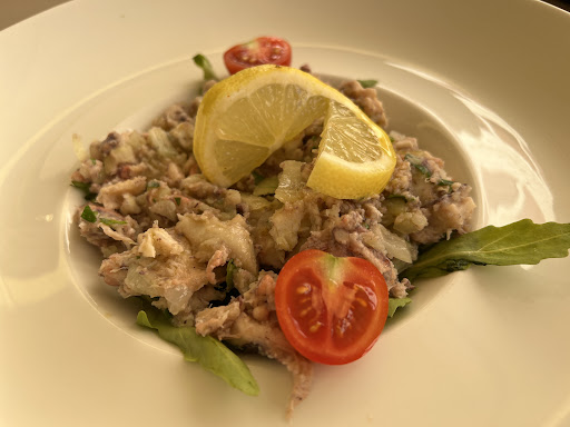 The food was normal. I was having octopus salad and I had a feeling that the octopus was frozen, or not well unfrozen, or too cold. I had a glass of white wine. The glass was visibly damaged by many uses in the dishwasher and the wine was warm. We also try chevapicy with ajvar and fries 🍟. The chevapicy were too oily. We wanted pancakes but it was over. Tiramisu was nice. The prices are also a bit high for the quality of the food. And then the biggest recommendation for improvement is the stuff. The cook was working with the gloves, but the lady who helped him didn't wear any. This doesn't make a good impression. Also there was some tension between one of the waiters and the others. He didn't service our table but he came a few times just to check on us, which was weird. Maybe he had good intentions but it was a bit weird. We also saw he was taking fries from the plate which was served to us. It was just one piece or 2 but still is not very nice to eat from the food of your clients. Our waiter was nice,...