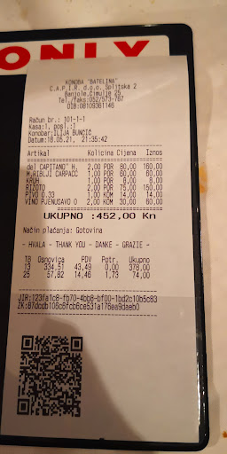 Read moreTrusting the very good rate of this place, we have made our experience at Batelina. Food is for sure fresh and directly brought by the daily fishing, which was very tasty and really great. The rest.. TOTAL RUBBISH. The service, in particular. We were worried about the little time available (1h 30m) to eat starter, first and second dish. We have been told there was enough time to go through. The result: service did not start the first dish in time, we waited 25 minutes, getting in the end, just the time to finish it and heating the waiter saying 'our kitchen has been already cleaned', at 21:20, 10 minutes earlier. In a fish restaurant we have seen barely fish. Congratulations. Last and not least, a very good price in the end, the equivalent of 61 euros, for one tiny starter (good for one person only - costing 160kn), and two first plates. That's it. 60kn in addition for a carpaccio we never asked for. Prices for a 'novelle cuisine' restaurant and I am very sorry that this was not specified while reading ratings on Google Maps. Well, feel free to read the cost of this place, BEFORE thinking to come here. EDIT: just forgetting to mention that you cannot use cards to pay. They say 'to accept any kind of cash'. I wonder if they declare their revenue to...