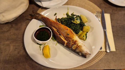 The service personell is really nice and we nearly immediatly got a place for two even though we did not reserve a place. You get complimentary bread as a starter and after ordering the food is served really fast considering for crowded it was. Outside there is a great view to enjoy. Inside it is not uncomfortable either but maybe a bit loud. The fish was done perfectly and the side ( potatoes and chard ) was ok. Some part of it was really salty such that it was nearly inedible. I even bit on a literal salt crystal. Otherwise the flavour was fine. The fried fish was also tasty overall. The mixed salad comes with tomatos, corn, cucumbers and a lot of cabbage. There is no dressing on it, you season it on the table to your taste.