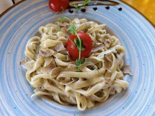 Die Tagliatelle waren perfekt gekocht. Die Trüffelsauce war unerwartet leicht (oft ist die Sauce schwer und liegt im Magen, was hier nicht der Fall war) und sehr gut abgeschmeckt. Die kleinen Bohnensprossen und Trüffelscheiben rundeten das Gesamtbild ab.