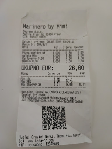 Read moreOsebje prijazno ampak ne govori hrvaško, samo slabo angleško. Naročil sem Hamburger s sirom za cc 12€ in dobil pica testo v obliki kebaba, in notri 2 čevapa ter nekaj dodatkov. Na krožniku je bil zraven tudi pomfri. Po pritožbi so rekli , da bodo popravili, da niso vedeli kaj sem naročil. Ko je žena že pojedla svojo pico s trdim slabim testom in skromnim nadevom za 11,80 € sem jaz dobil svoj Hamburg s sirom. Na prvi pogled je bilo vse isto samo brez pomfri krompirja, zato sem tudi to zavrnil, nisem bil več lačen. Druga natakarica ki je govorila hrvaško je rekla, da je normalno, da ni bombetke, da to ni potrebno, ker je lahko drugo testo...Na začetku ob naročanju piva 0.5 litra sem nekako dobil takšno pivo ampak z 0,0 % alkohola. Pivo so mi zamenjali. Plačal sem pico, mešani solato za 6,8€, ki je bila lepa ampak zelo skromna, pijačo in smo končali. Brez opravičila ali česar koli drugega... Če želite slabo jesti in se igrati ruleto kaj boste dobili za piti in jesti potem...
