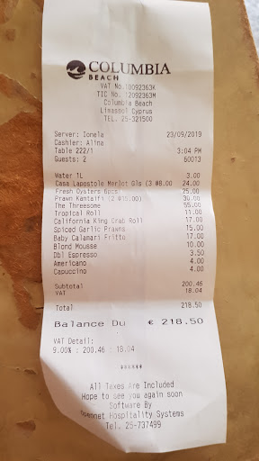 Read moreI am quite disappointed with this place. What could have been a good experience turned into a frustrating one. I know 2 stars seems harsh, but let me state my case. We were 3 couples taking a break from our kids. It was a weekday so the place was pretty much empty. We paid the 40 or 60 euros to get the fancy beds and all seemed smooth and good. Then we decided to have lunch. I checked the beach menu, I was in the mood for a burger, and luckly they had what I wanted, we then decided to sit at the reautrant. Long story short I asked if I could order the burger from the beach menu and sit in the restaurant; now keep in mind everyone else was ordering from The restaurant menu, however, they refused as one waiter after another gave me one lame excuse after the other, they even roped in the chef who seemed incapable of getting orders from the beach but delivering it to the resturant, becuae its sooo complicated. Anyway I ended up ordering my burger then carrying it myself from the beach/sunbed area and sitting in the restaurant, which by the way is only a few meters away, cause lame illogical excuses dont work on me. Here is the kicker, I saw the waiter come out from inside the restaurant with my beach burger and took it to our sunbeds, and when we got the bill, all our drinks and food from the sunbed area and restaurant appeared on the same bill!!! Which totaled about 600euros, so what was all fuss and refusal about? What a dumb thing to do to your customers. I decided to write review this cause our money keeps these places open, so columbia club managment do me a favor and treat your clients well and with respect cause we vote with our wallets,...