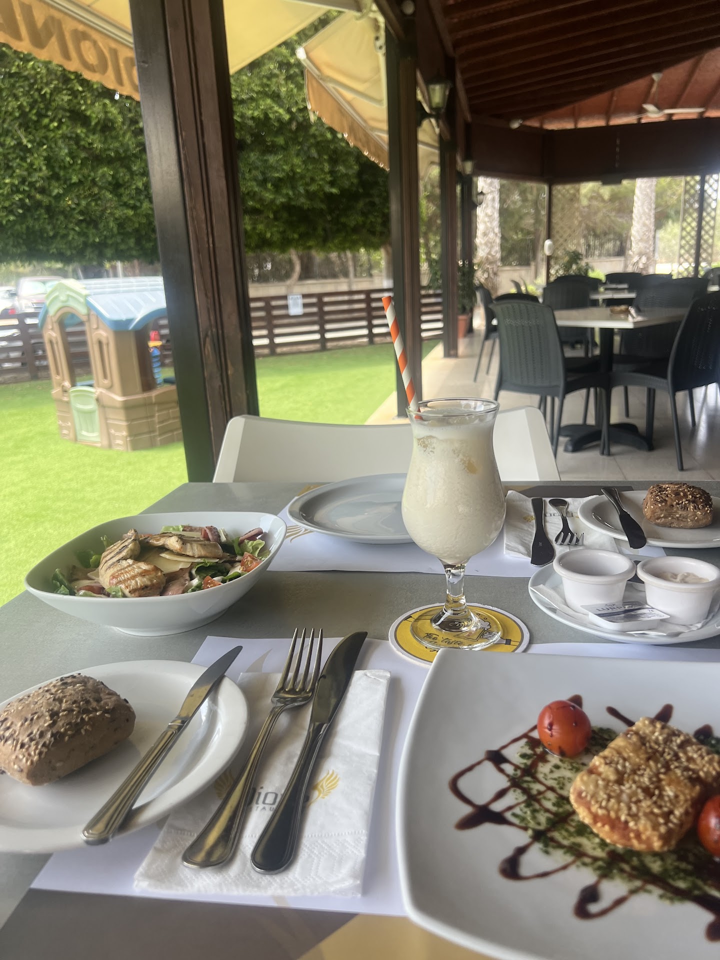 Read moreThis restaurant is very well located close to the Nissi beach, although it was surprisingly empty when we arrived. The outside seating areas is humongous and very well protected from the sun which is a huge plus. The stuff is very attentive, which was not difficult with only 3 tables occupied, but still very pleasant, of course. We tried the aubergines and the vegetables wraps, both were very good with a perfect balance of texture and flavors. The Cyprus quantity of the food wasn’t there, but they were not main dishes after all. I also would like to highlight modern and spotless bathrooms which is always a great bonus to the overall cleanliness of the place. It was a pleasant experience and I would definitely definitely return for a...