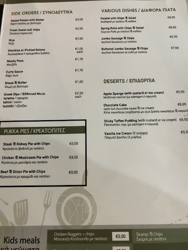 Read moreExpecting something good , the kitchen looks very clean and staff are friendly. We ordered a take away and Waited over 20 minutes for our food , which we didn’t mind because the waitress told us it was all being cooked fresh. Once we got home we were unsatisfied. We ordered kalamari and chips, halloumi in a pitta, fish cakes and chicken kebab. The kalamari was like cardboard and fried to death and chips were also pre cooked and re-fried, as well as the halloumi,which was brown and tough, it was clearly precooked earlier on and re-cooked to order. My daughter ordered chicken kebabs which were good. The rest of our order was thrown away and not edible. Very unfortunate as our order costs us over €40, expecting...