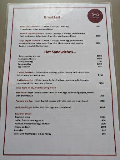 This coffee is the most traditional and similar to English tastes; breakfast options, soups, coffee, snack food. The atmosphere is regularly very friendly. They have to sit inside and outside, they accept cash or card, combo options on their menu. To consider if you are in a wheelchair, the bathroom is on the second floor. They have board games for children, food quality is fairly consistent. If you are in Girne you must go to Tims, it is in the main street square and has other shops nearby and even a...