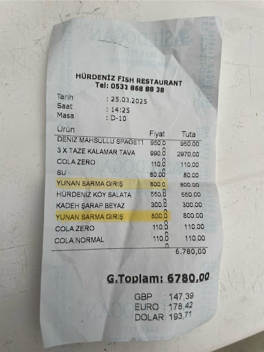 Foreigners be careful here! We ordered 4 pieces of grilled sea bream and salad. The food was ok but nothing really special. The atmosphere is quite nice. BUT...it seems that they are cheating on foreigners with prices. When we came to the restaurant we saw a menu at the entrance and the price for sea bream was 250TRY. But after eating we got a bill with almost 2 times bigger price (450TRY for a sea bream). We asked why the price is so much higher, but the waiter told us that our seabrem was from another "special" menu and that is why it is more expensive. What was a lie. We did not see any "special" menu. And even if there would be any kind of "another" menu they must inform their clients clearly about it before ordering. Moreover the waiter brought us a vine and said that is really good vine, and the price for the bottle was 650TRY. But the exact same bottle of wine in the supermarket costs 120TRY. I understand that wine in the restaurant is more expensive. But 5x more expensive is not normal. And finally when the waiter came to collect our payment he said a total price of 2740TRY without giving us a receipt. The we asked the receipt the total amount was 2540TRY (200TRY smaller). We asked why he has told us bigger amount he said that he included...