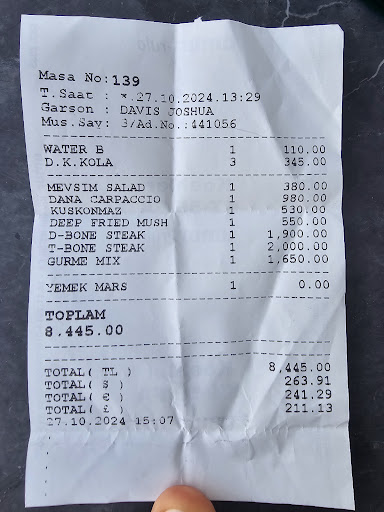 We had ordered three of the most expensive items on the menu, the tomahawk steaks, expecting quality. What we got was tough, overcooked meat with absolutely no seasoning or flavour. It was like chewing rubber. Even the sides were uninspired and cold. For the price we paid, we expected a premium steakhouse experience, not something that resembled a budget roadside diner.