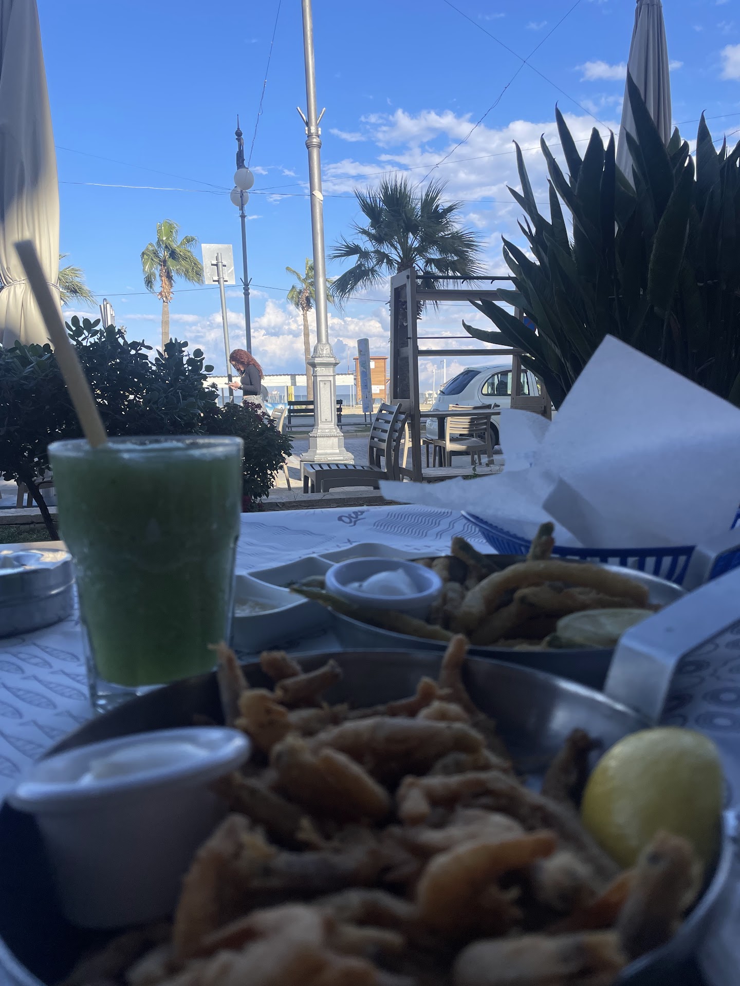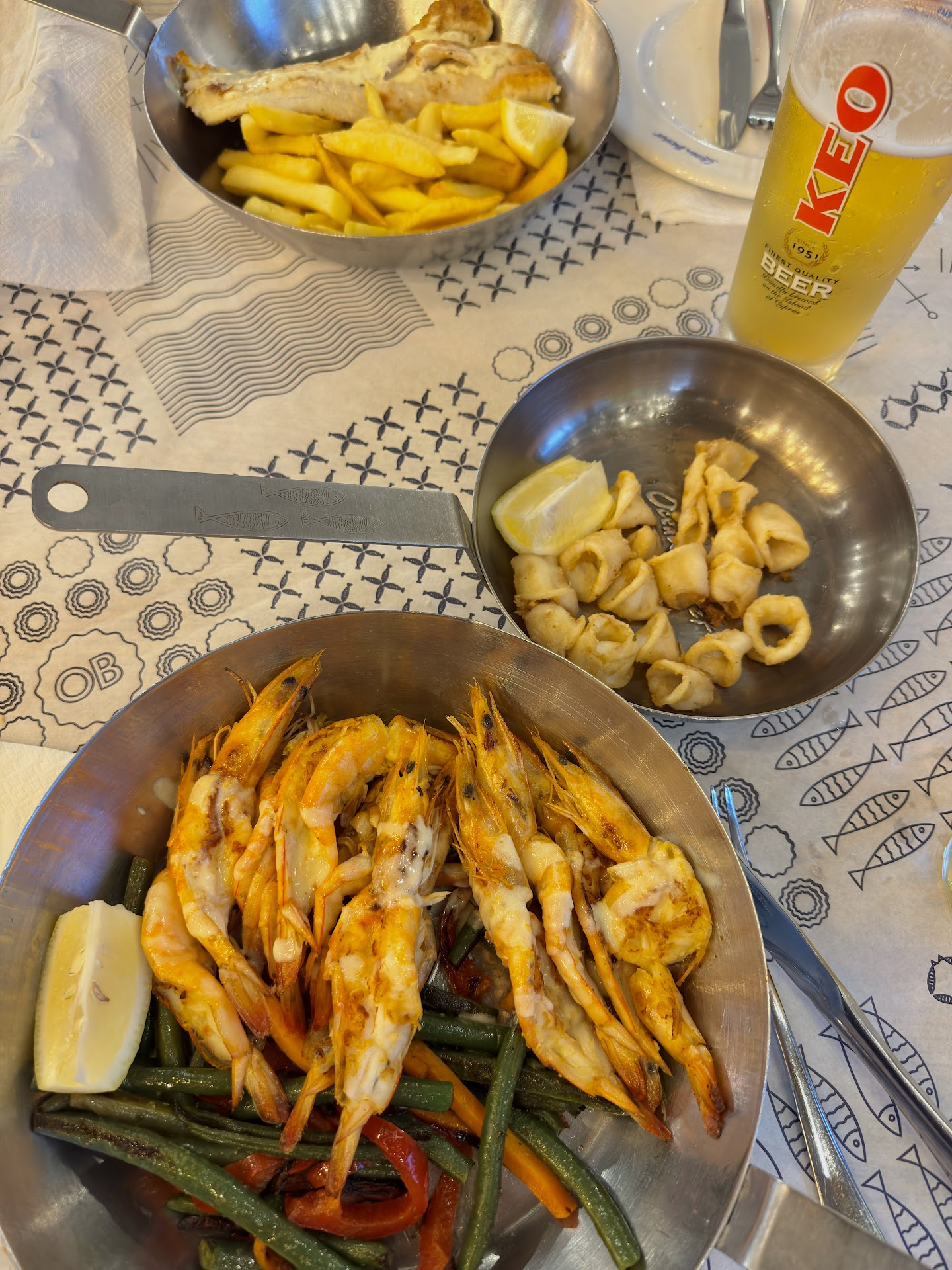 We arrived at the restaurant which at first glance look really impressive the menu was appealing until we asked the waiter if the fish was fresh (considering it’s on the sea front and is a fish restaurant) we were shocked to find out only 2 of the fish salmon and sea bass on the menu were “fresh” When starts arrived the garden salad was lovely! Atherina was ok considering they were frozen Calamari not so good also frozen. Our main course then arrived we ordered sea bass and salmon. When they both arrived very quick service I noticed the inside of the salmon was under cooked. The waiter quickly noticed and apologised and organised a fresh course to come. After it arrived 10-15 minutes later it was already cut into by the staff to check if it was cooked I then cut into myself and it was rubber it was overcooked on the outside and still raw on the inside - the fish was definitely frozen although originally told was fresh The sea bass was also not great and probably frozen. Chips were also frozen and cold … if a restaurant can’t cook chips I won’t trust them to cook fish. When the waiter came back the second time about the salmon he was quite cheeky and questioned that it was still raw he then took everything else off the table with attitude and walked to the kitchen. The rest of the staff then ignored our table when trying to pay the bill.