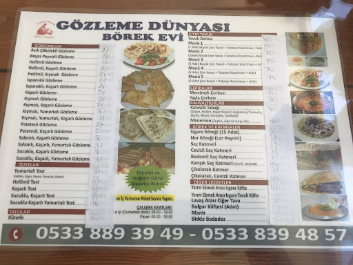 Read moreGözleme yemek için güzel bi mekan porsiyon dört dilim olarak servis ediliyor biz kıymalı karışık patates ve ıspanaklı olarak yedik güncel fiyatı aşşağıdaki listede bulunmaktadır ben en çok kıymalı olanı beğendim tavsiye edebileceğim bir gözleme gittiğimizde boş du ama paket siparişi çok aldıklarından gözleme biraz geç geldi sıcak bir şekilde sunuldu kolay gelsin...