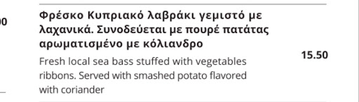 And here comes the main disappointment - main course - âFresh Seabass stuffed with vegetablesâ, waiter places the plates on our table and to our full surprice ..itâs a rolled fillet with veggie strips in it! At first I am like, how could we make such a mistake and miss the fact itâs a fillet! I check back the menu once again, and it says nowhere its a fillet (attatched the picture). We ate sea bass (fillet was good for London or Berlin âŚbut we are on Cyprus), never got bread for tzatziki, didnât even touch it (imagine eating just tzatziki with a spoon).