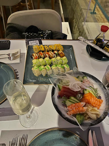 The food was very mediocre - not very fresh or well seasoned. Only salmon sashimi was ok. The dessert was way too elaborate (burnt Alaska with cotton candy) and instead of a Cointreau they poured Sambuca which has a gnarly taste not suitable for a dessert at all.