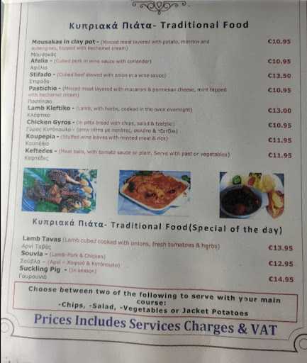 In Afelia we got meat, rice and chips - we were very surprised with rice and chips? With no vegetables? After that we read on the menu that we could choose between chips, salad , rice and vegetables - what a pity that the waitress didn't ask us what we would like and decided for us. Besides that the meat was very salty but eatable.