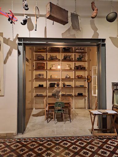 the kitchen is open and you can have a peak onto the steams of deliciousness crafted there by the chefs. lots of attention was paid to the vintage style decoration. there's a wall of mirrors and you'll find a puppet, many typewriters, a map of cyprus, a tv and many more details placed in different corners of the restaurant. even a bike and a suitcase hanging from the ceiling ! the old coca cola ads and decors are a bit unsettling, i wonder why they would want to bring in the vibe of big capitalist companies into this wonderfully authentic local restaurant.