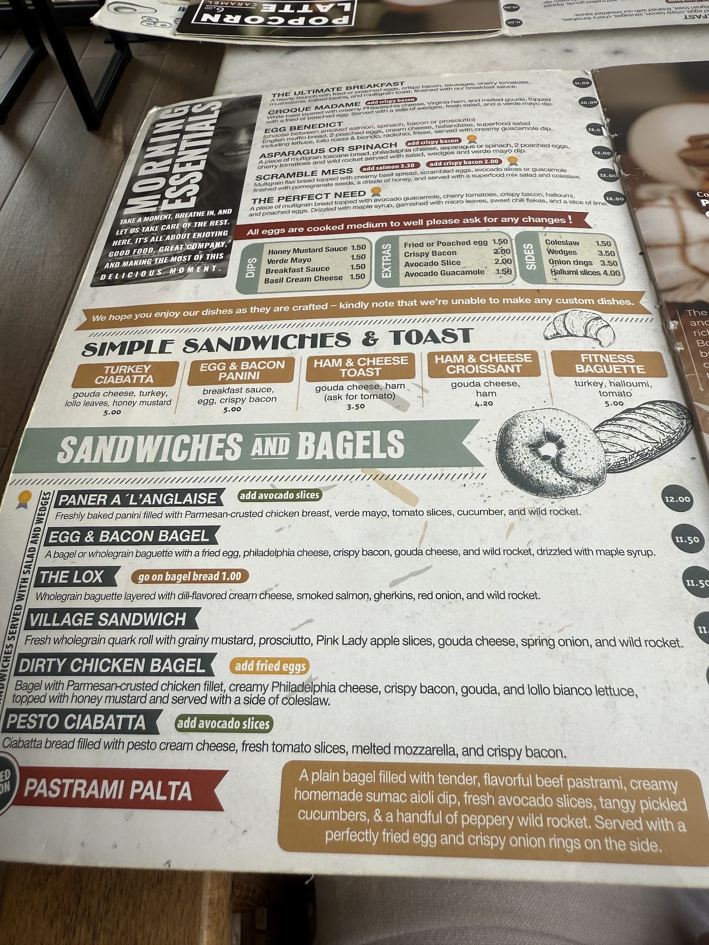 For breakfast, we had two flat whites with oat milk, and a cappuccino with almond milk (they also have more veg milk alternatives available) to drink. We also had an “ultimate breakfast” (I swapped the bacon for sliced avocado), a “fitness baguette”, and an “eggs and bacon panini”.