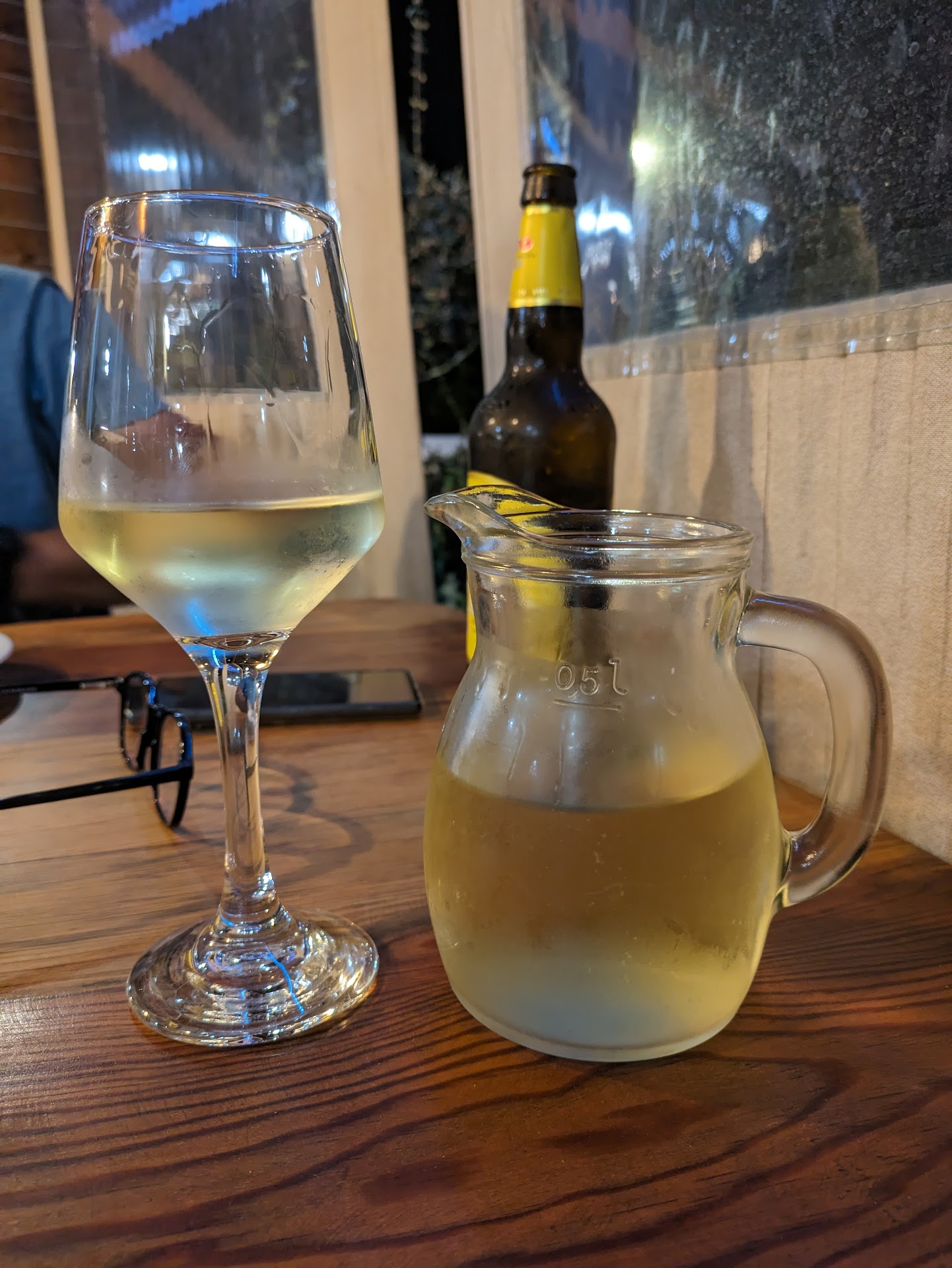 We firstly ordered a salad as a starter which was quickly scribbled out when we ordered the Mix for Two, we forgot the mains included a salad. You can get bottles of wine but the carafe of village wine is some of the best we have tasted. The meat of chicken, pork and sheftalia style kebab was cooked to perfection, succulent, juicy and seasoned with herbs, totally delicious. The homemade chips are sprinkled with herbs as well, scrummy.