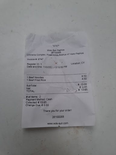 I thought for a long time about whether to write a review, but I decided to share my experience. I ordered two dishes: rice with beef and noodles with beef. Since I came from home and had checked the menu online in advance, I brought 24 euros. My dishes cost 13.65 euros. I handed the waitress 24 euros, as I had calculated at home that I should receive 10.35 euros in change. I received my change in small coins, for which she apologized. While putting the money into my wallet (which was empty because I had given her all my cash), I realized too late that she had only given me 7 euros in change. I had no further opportunity to say anything, as I would have had no way to prove she shorted me. The receipt was printed in advance, so it shows 0.00 euros, and there’s no way to prove how much I gave and how much change I should have received. My mistake was not counting the change in front of her. The food was very tasty, but I definitely won’t return due to...