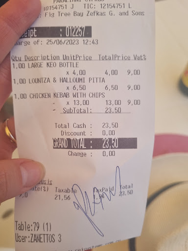 Read moreNEVER EAT HERE! Went for a quick lunch whilst at the beach. The experience could not have left me more dissatisfied. We ordered a child’s sausage which arrived RAW. Not only was this annoying, but also extremely dangerous! The experience only worsened from here when the two moussakas that we ordered arrived not only cold but still frozen in the middle! We sent them back without bothering to ask for a replacement, as we did not wish to risk our health on the food that was ‘cooked’ here. The rest of the meals we ordered were average at best, the quality of the ingredients was poor but at least the spaghetti was edible. The prices were extortionate for what was served. The only positive - the children’s playground kept the kids entertained during the incredibly long wait...