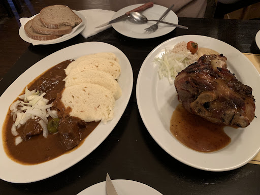 We opted to get a table in the court yard though it was a little breezy. When we sat down at the table we were served immediately (actually one of the nice servers took us out to the courtyard since we entered the establishment from the restaurant entrance). The servers were friendly and prompt. My beef goulash was perhaps a little lukewarm, but it was tasty nonetheless. I can't say it was the best I ever had, but it was good. In fact, I had a very good beef gulasch recently in the Lake Region in Austria. I must say I was a bit thrown off by the appearance of "bread dumpling" here. It looked like pieces of bread in oblong shape (photo), and they certainly were pieces of white bread?! I wasn't expecting that at all??