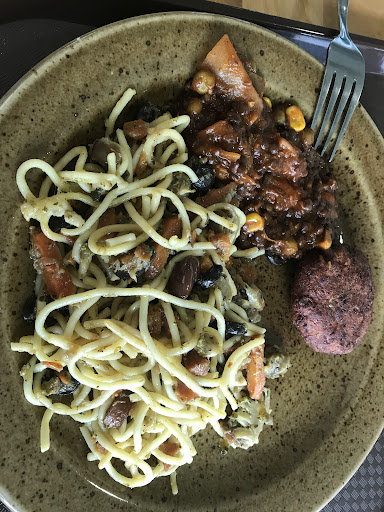 I am returning customer! Although a bit pricey, the offer is just good here. I come for lunch occasionaly. The offer of soups and main courses is very good. I am not any sort of vegetarian, but I really like it. The atmosphere here is quiet and I aleays slow down in the day. The only thing I do not like: the deserts just look good, but do not taste good. I do not take them. I attach my main dish from yesterday 2nd January, delicious: spagheti, lens and vegetable smashed...
