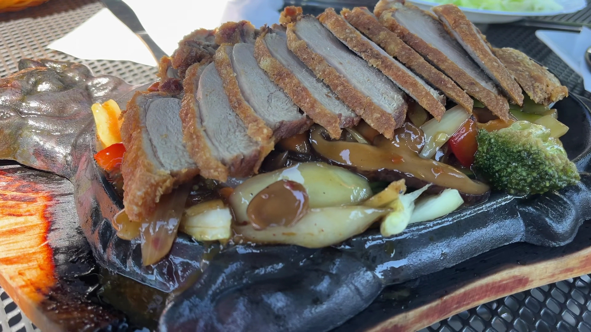 Ich kann die positiven Rezessionen hier leider garnicht nachvollziehen. Wir haben heute 8 schätze bekommen und mein Mann wurde fast verbrannt. Das Essen kam so heiß an den Tisch, dass das Fett uns alle bespritzt hat. Mein Hühnchen mit Soße war so versalzen, dass man es nicht essen konnte und ALLES ist im fett geschwommen. Das eine essen haben wir zurück gehen lassen nachdem wir voller Fett-Spritzer waren und den Rest haben wir fast vollständig auf dem Tisch gelassen. 40 Euro bezahlt und mit Leberversagen rausgegangen. Das war wirklich das schlechteste essen, das ich jemals bestellt hab. Schade! Die Bedienung war aber freundlich, das muss hier auch explizit erwähnt werden. Der Spielplatz ist übrigens defintiv kein...