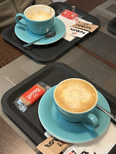 The coffee was quite uniquely good, with a taste I can't recall ever experiencing before. Today, one cappuccino, one caffé latte and one slice of cake were 240 Czech Crowns in total.
