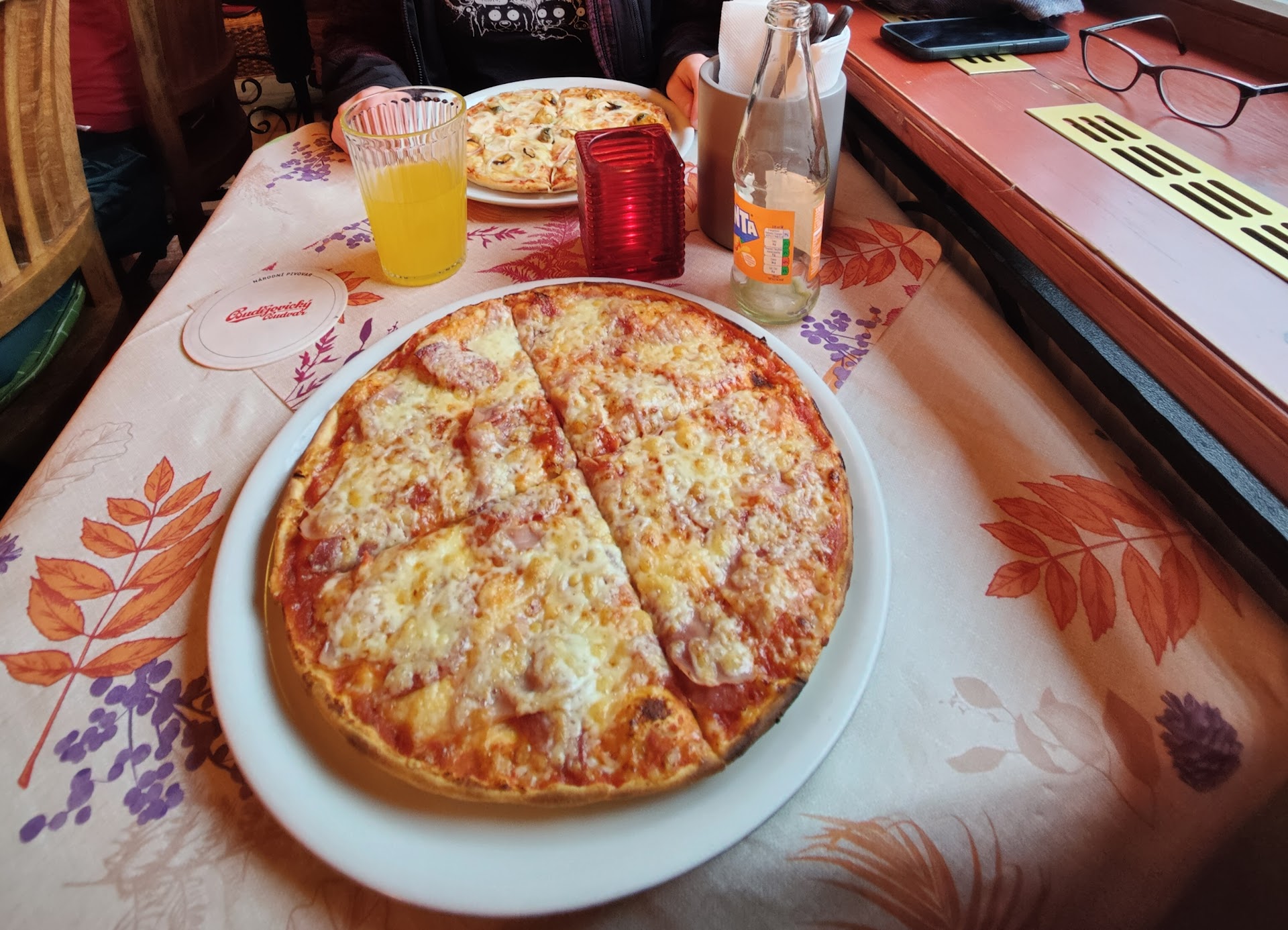 My last experience with Mamma Mia was pre-pandemic, ordering pizza on the phone - the staff was usually annoyed, borderline rude. This time we stopped by in person, party of 6 people, order of 3 different pizzas (small Prosciutto and Pachino, big Prosciutto) and Tortellini Formaggi on a hot plate, total around €46, which was acceptable for the portions and the quality of the food. The owners(?) were friendly and attentive, my only problem is the furniture arrangement of this place. It is quite difficult to navigate around, when the place is even half full, you keep bumping into or keep asking people to move in order to get up. You also can't pay with a card, so...