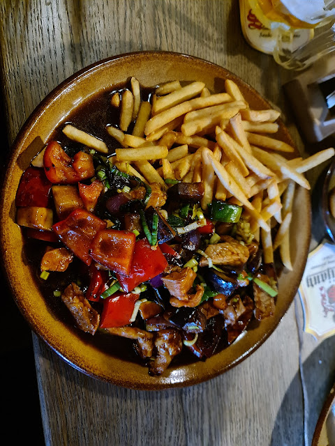 This establishment was visited for the purpose of sampling local beers and dining. The interior design was notable, featuring robust wooden furniture, various copper decorative items, and hanging figures resembling devils and witches. The restrooms were observed to be clean and spacious.