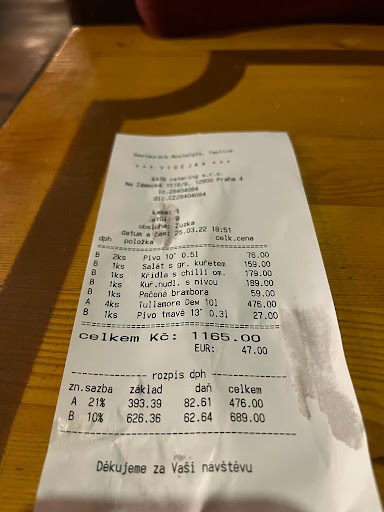 Dobrý den, Chtěl bych se s vámi podělit o svůj zážitek, v této restauraci ze dne 30.6.2023. Bohužel velice nepříjemný. S přítelkyní jsme si zašli na oběd a chodíme sem docela často. Sedli jsme si venku na terasu a čekali na servírku. Po 10ti minutách přišlo, my si objednali výbornou točenou kofolu a prohlíželi si jídelní lístek, i když jsme předem měli jasno. Objednali jsme si grilované kuřecí prso v sýrové omáčce s kroketami a s mlsným jazýčkem čekali. Uběhlo 10 minut, nikde nikdo. Po 30minutách, kdy jsme měli oba před odpolední směnou, jsme se už dívali okolo zda ostatní jídlo mají. Samozřejmě že nejspíš "šéfové" kteří přišli až po nás, a my čekali už 45 minut tak dostali jídlo atd během chvilky a my pořád čekali a čekali. Po neúprosném čekání v podobě 50ti minutách jsme se dočkali naší objednávky. Krokety super, na tom se asi nedá nic zkazit, sýrová omáčka taky fajn ale bylo jí málo no a to co na tom má být nejlepší grilované kuřecí prsíčko, bylo velmi tuhé až gumové jako žvýkačka... Obsluha nikde, nikdo nebyl přítomen a tak nakonec z toho neskutečného čekání a už hladový jsme to celé snědli ale teda... Čekali jsme dalších 20min než jídlo odnesou ale stále se nic nedělo. Bohužel nás tlačil čas a tak jsem šel k baru a jídlo zaplatil a rychle do práce. Dopadlo to tak, že mě z toho bolí nesmírně zuby až jsem si musel vzít ibalgin, protože to je hrozná bolest. Mimochodem od obsluhy jsme nedostali ani žádnou omluvu za čekání a i když jsem řekl, že "už jsme to jedli lepší" tak žádná reakce. Po této zkušenosti, už opravdu NÉÉÉ. To si radši zajdu naproti do večerky pro rohlík se...