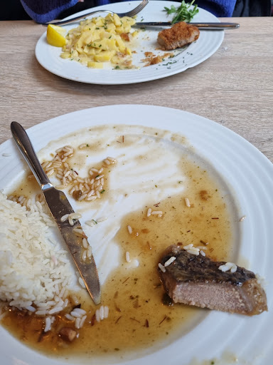 However, were here for a late lunch/early dinner started with a cold soup. Then the mains came, the meat, as pictured, was so dense and chewy it was a bit hard to eat, with a bland and quite meh sauce. Schnitzel was cooked to heck and then some, very dry as well, and I had to spit a piece that was so chewy I couldn't swallow it...